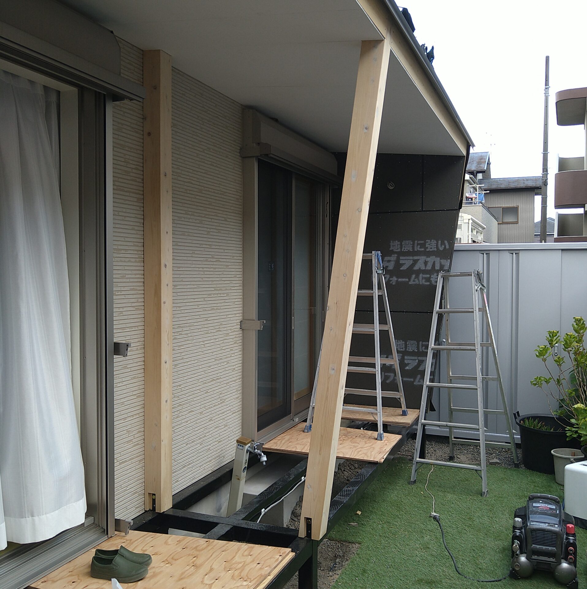 リビングからの掃き出し窓部分に新規にテラスを付ける工事をしていました。