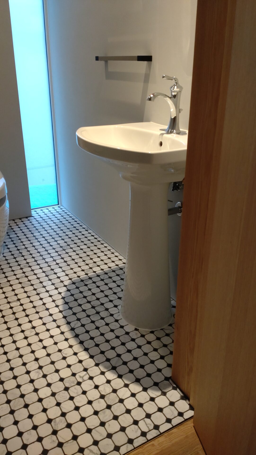 トイレの床にはハンドメイドで作られたサブウェイタイル。