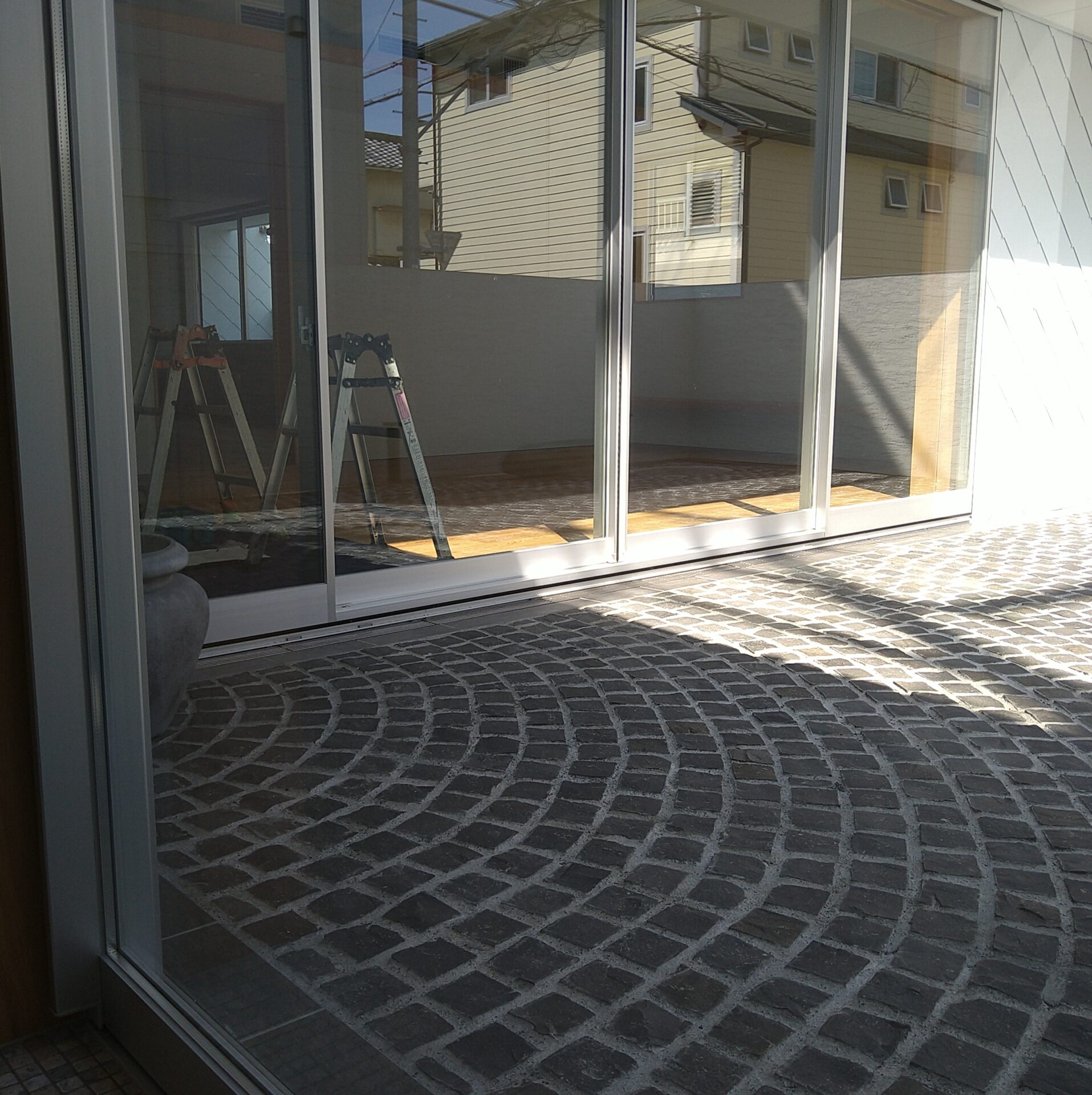 エントランスに続くアプローチの石は大盤のノンスリップタイル。
