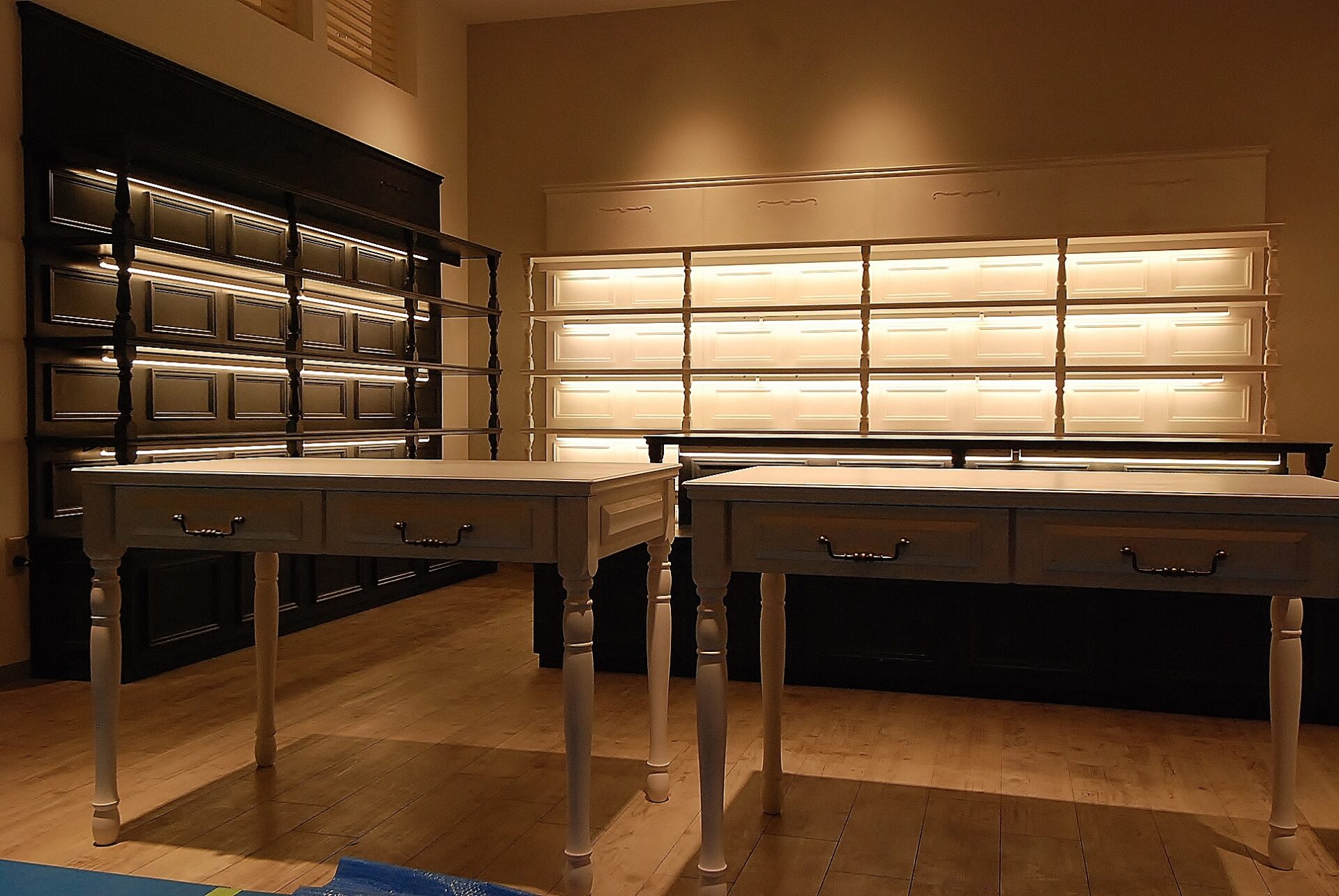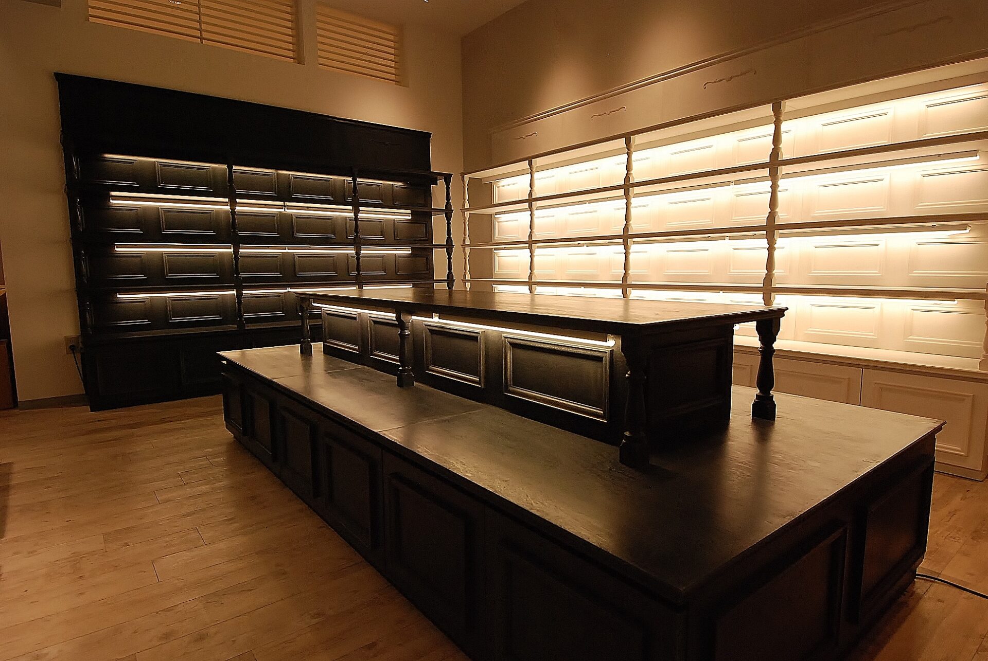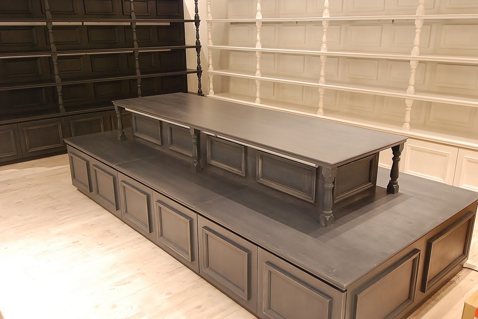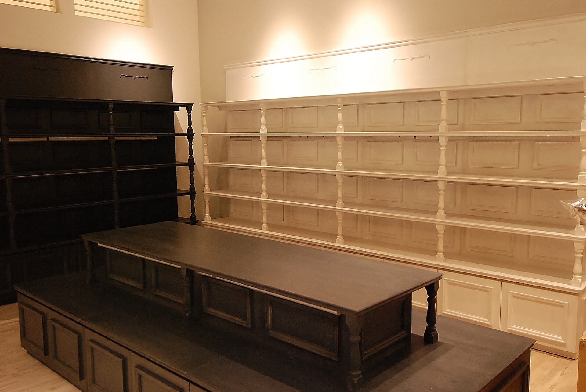 壁面のシェルフと中央には2段になった低めのディスプレイ台・デスクも製作。