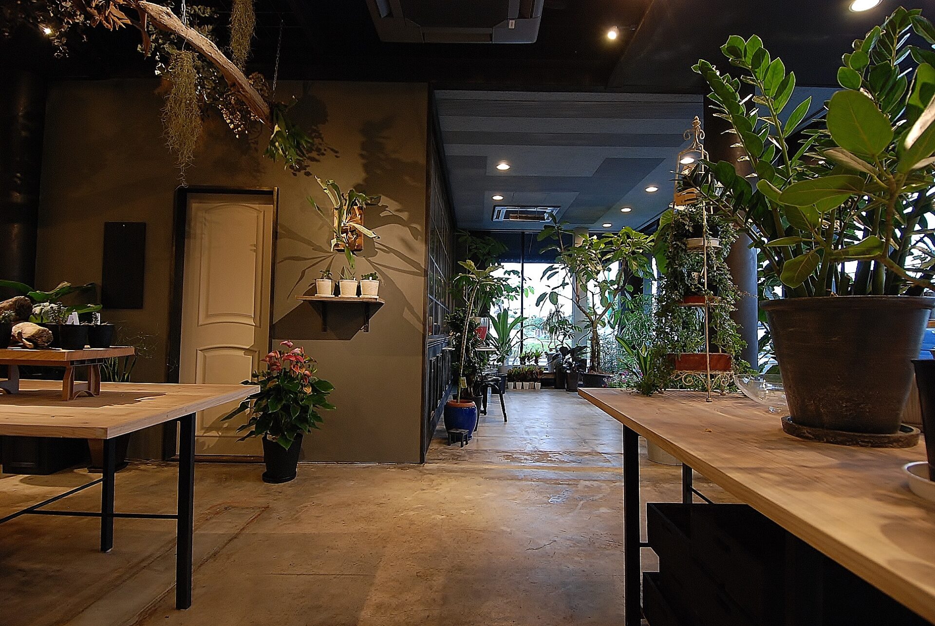 オリーブグリーンの塗り壁と黒塗装の天井。